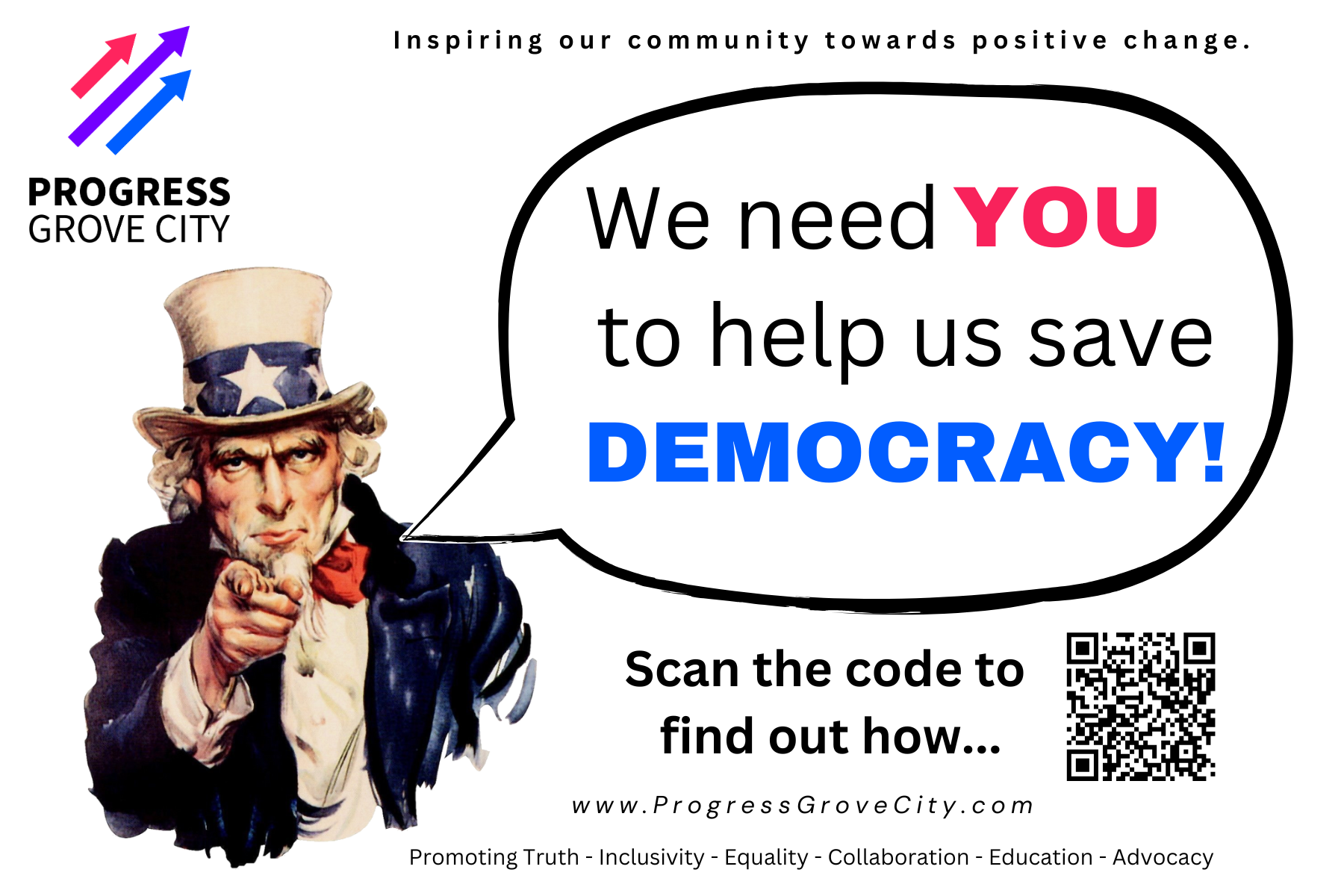 Talk to three friends or neighbors about ProgressGroveCity.com. Have them visit the website or send them to our Facebook group!